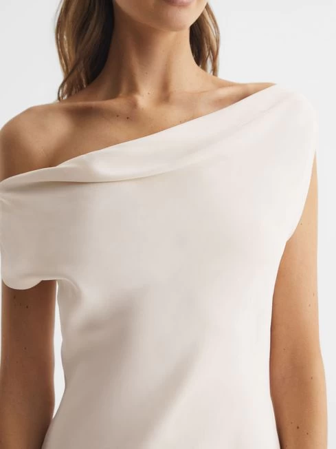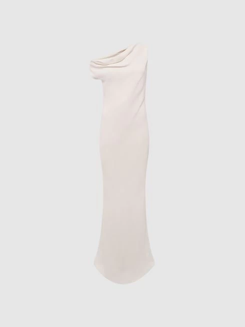 Embrace simplicity with the nude Loretta dress. Its satin-feel fabrication drapes elegantly across the frame in an off-the-shoulder design. It finishes at a sophisticated maxi-length. Curate a charming bridal edit with satin heels and a coordinating clutch bag.