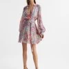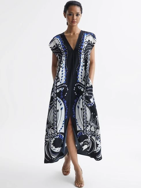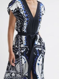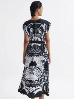 Expand your special occasion collection with the Freja dress. It’s designed in an abstract printed fabrication and fitted with short, split sleeves and a deep V-neckline. The figure is cinched with a waist belt, and a front slip offers subtle interest. Style with black shoes to emphasize this piece.