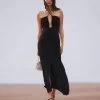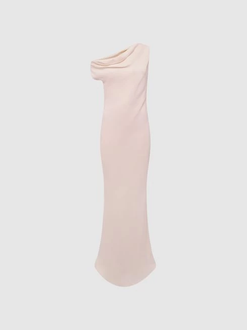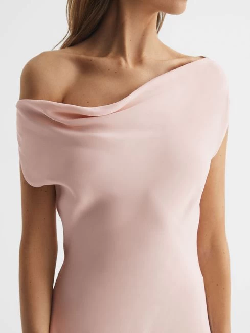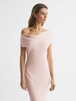 Embrace simplicity with the nude Loretta dress. Its satin-feel fabrication drapes elegantly across the frame in an off-the-shoulder design. It finishes at a sophisticated maxi-length. Curate a charming bridal edit with satin heels and a coordinating clutch bag.